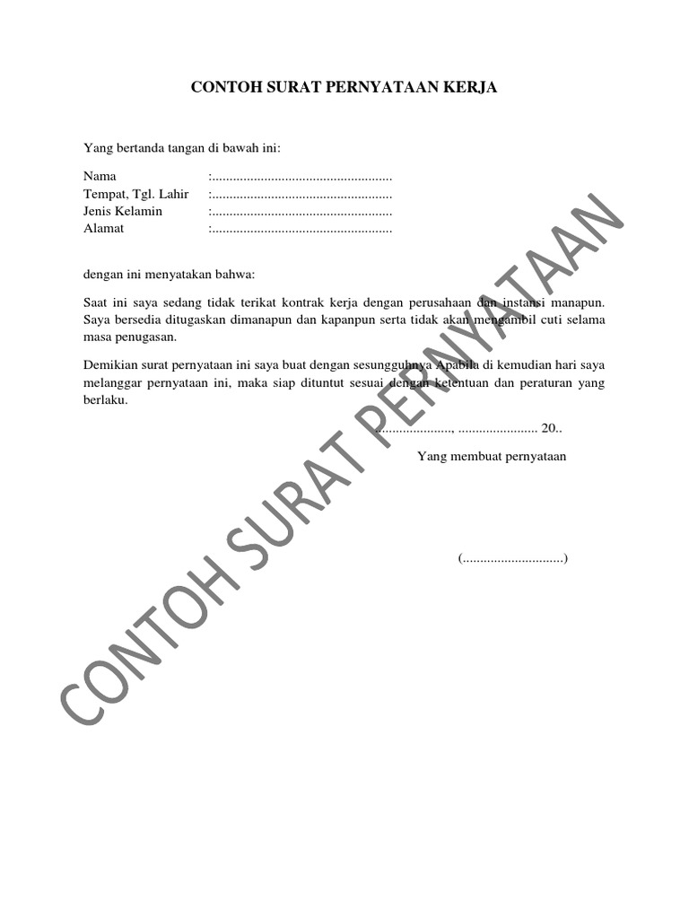 Hal ini karena mengingat bahwa orang yang awam sekalipun mayoritas pernah membuatnya untuk keperluan tertentu. Surat pernyataan adalah surat yang dibuat untuk menyatakan bahwa seseorang telah atau tidak pernah melakukan suatu hal. Surat pernyataan kerja atau spk secara umum bisa diartikan sebagai jenis surat yang dikeluarkan oleh sebuah perusahaan atau instansi kepada pegawainya guna 3 contoh surat perintah kerja resmi perusahaan. Surat pernyataan biasanya dibuat oleh orang yang ingin menerangkan sesuatu agar bisa dipercaya oleh penerima surat. Ketika anda melamar pekerjaan di perusahaan tertentu dan anda diterima bekerja disana, tentu saja pihak perusahaan ingin agar anda.